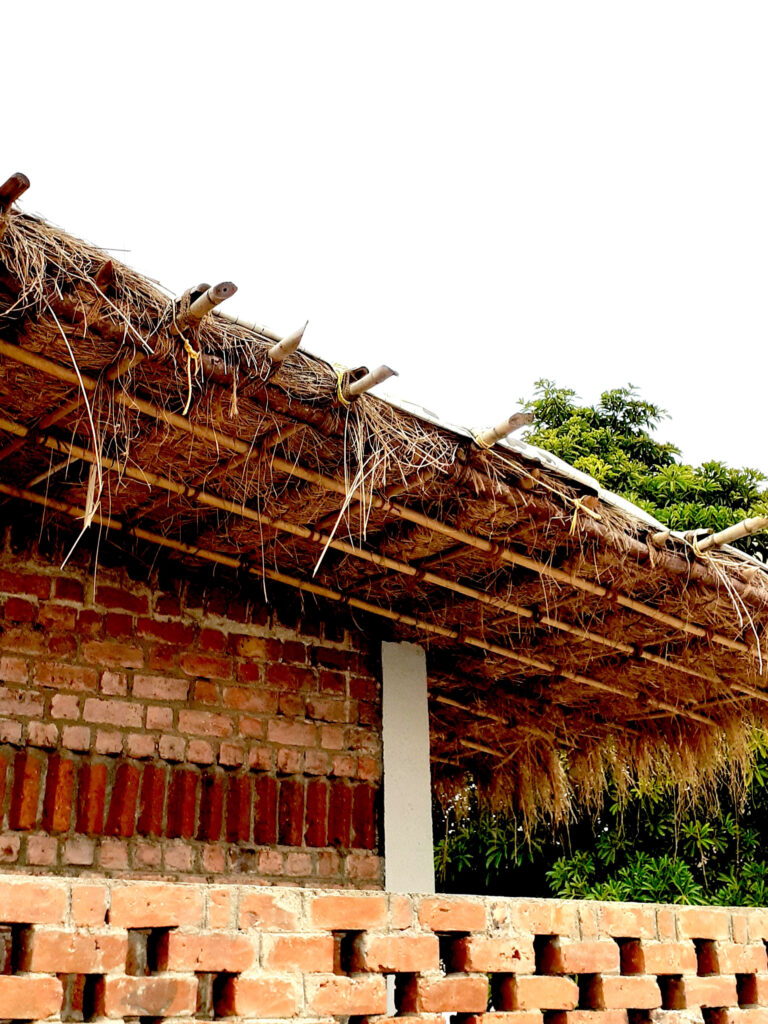 Locally available water reed is used as thatch for the roof which is cost effective as well. This inclined thatch combined with bamboo keeps the space cool in summers.