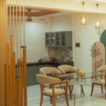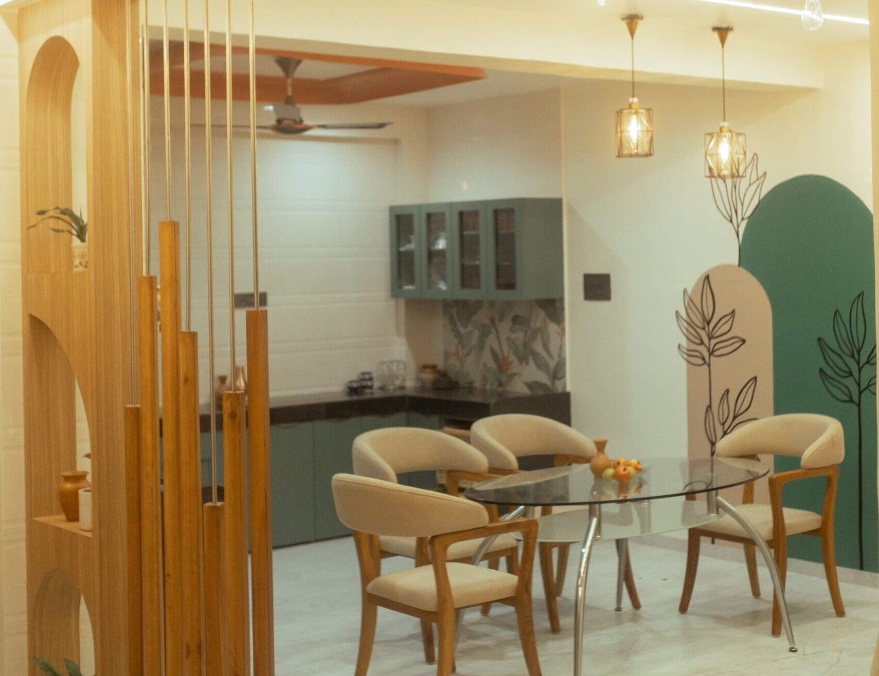 At the entrance lobby, inverted pots have been creatively repurposed as hanging lamps, adding a rustic charm. This lobby leads into the dining area, where walls are adorned with floral-patterned paintings that enhance the artistic appeal.